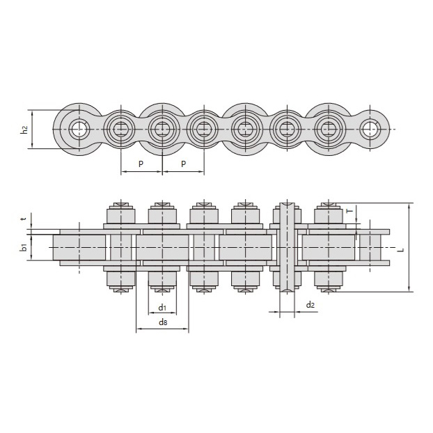 • Konštrukcia veľkého a malého valčeka:Prvý valec má priemer väčší ako výška vnútornej reťazovej dosky, čím je jeho vonkajšia plocha vystavená za koncom reťazovej dosky. Druhý valec je menší, s priemerom menším ako výška vnútornej reťazovej dosky.
