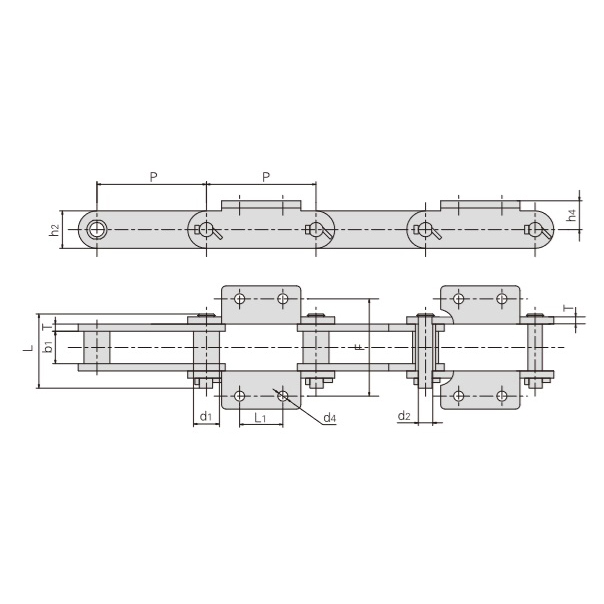 - Spojovacie platničky v tvare L – vertikálna časť pripevnená k hornému koncu vnútornej platničky reťaze s horizontálnymi montážnymi otvormi – zlepšujú rozloženie zaťaženia a zabraňujú deformácii alebo poškodeniu v dôsledku nerovnomerného pôsobenia sily.