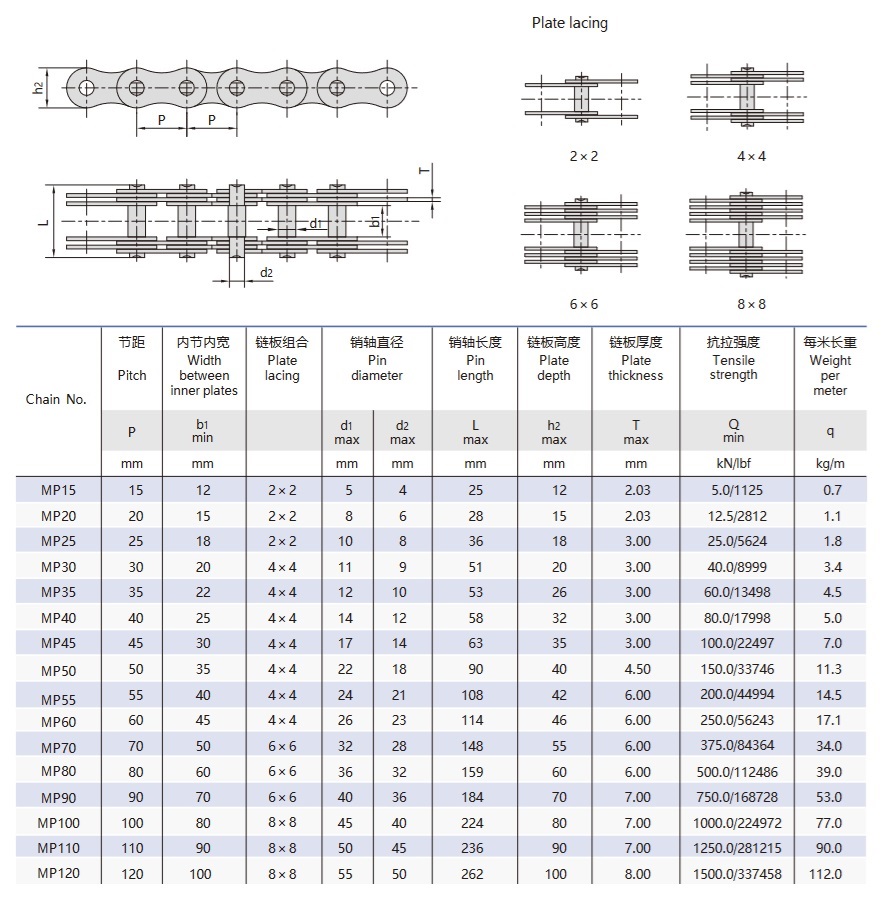 - Kombinácia dvoch hrubých reťazových dosiek a troch tenkých reťazových dosiek, ktoré poskytujú rovnomernú a symetrickú silu bez dodatočných ohybových momentov.