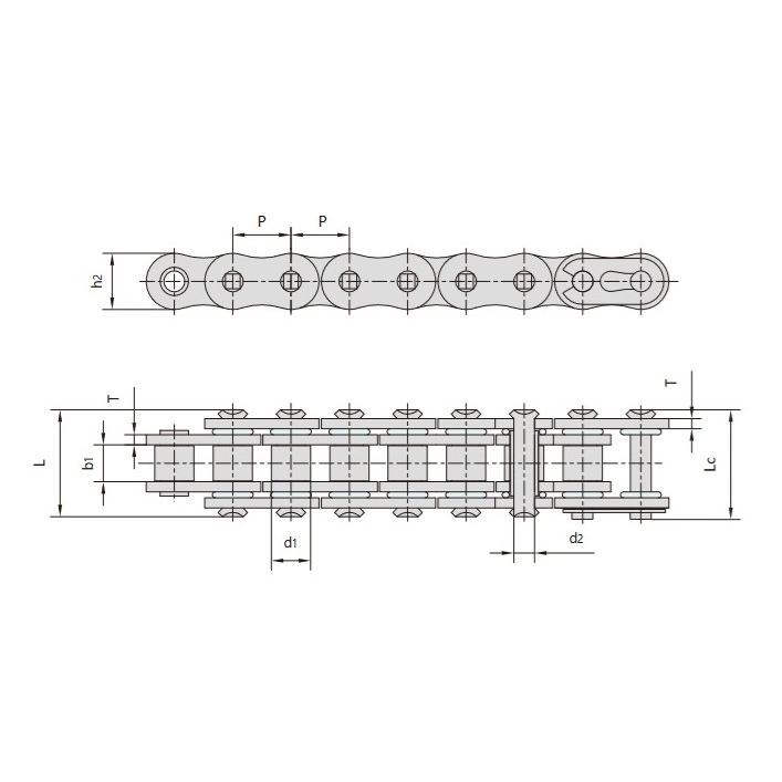 - Vnútorné platničky a čapy reťaze:Viac párov vnútorných dosiek reťaze je spojených čapmi, čo zaisťuje robustný a stabilný prenos sily.